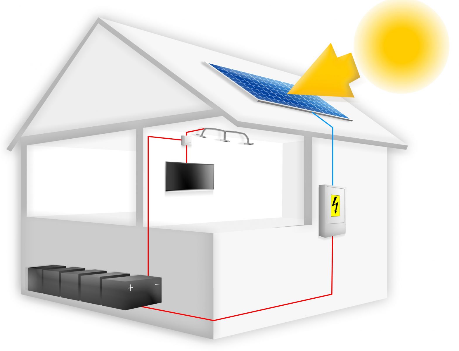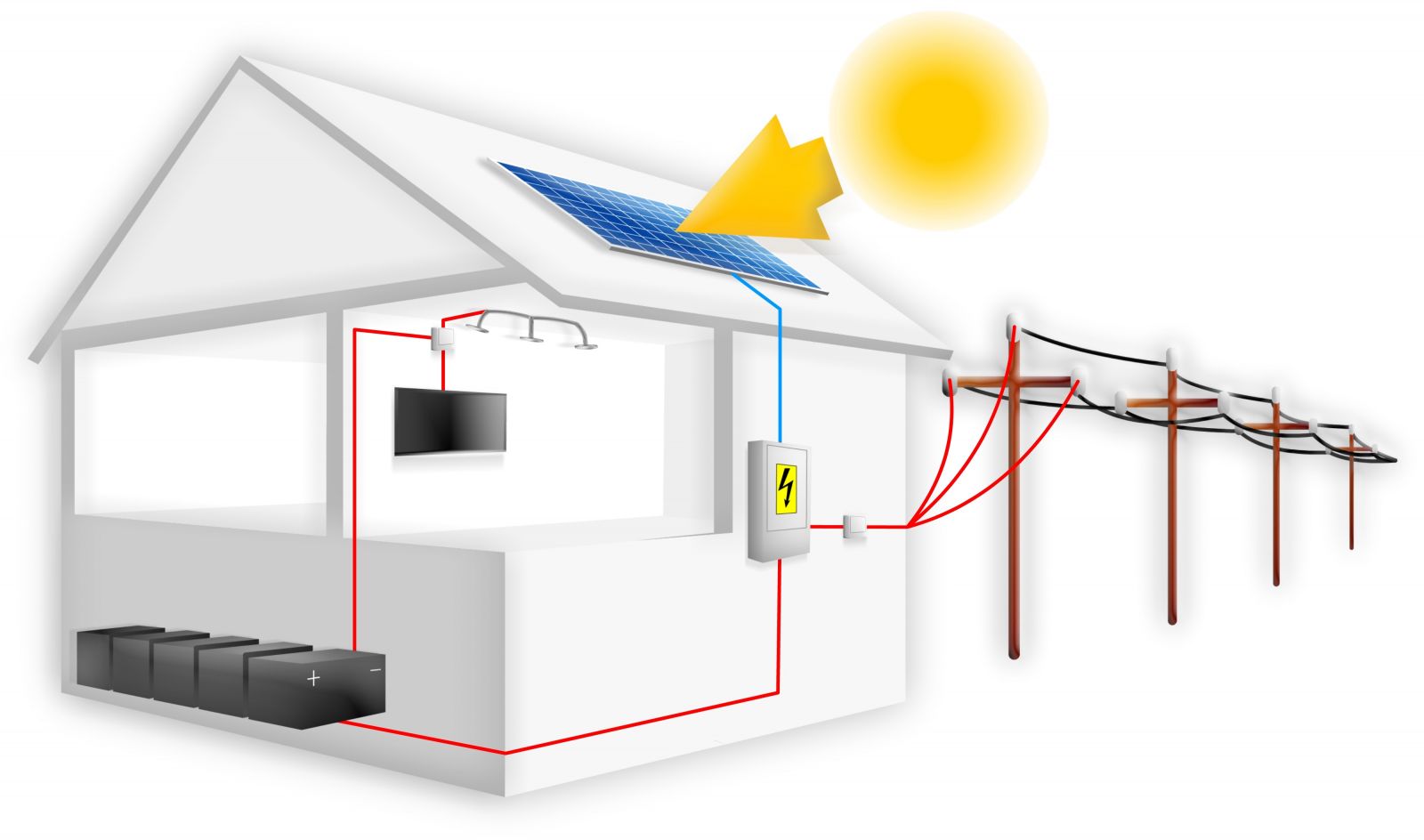 Les systèmes hybrides sont des systèmes connectés au réseau qui comportent des panneaux solaires, un onduleur et une batterie. L’excèdent d’énergie est stocké dans la batterie pour être utilisé plus tard lorsque le soleil ne brille pas.